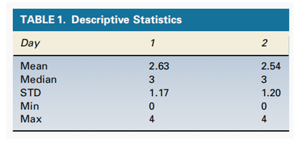 對每日評分進行描述性統(tǒng)計(標(biāo)準差、平均值、中位數(shù)、最大值和最小值)計算(見表1)。評級的穩(wěn)定性以雙變量散點圖(氣泡圖)的形式進行可視化。氣泡圖是一種在散點圖上表示變量間關(guān)系的方法。兩個變量的觀測值以常規(guī)方式繪制,使用圓圈作為符號;圓圈的半徑與第三個變量的關(guān)聯(lián)值成比例。給定分數(shù)的頻率決定了氣泡的大小,這些氣泡理想地位于對角線上。