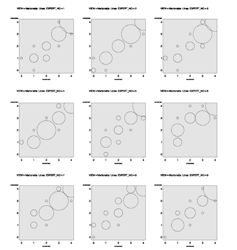專家們達成高度一致性,氣泡圖(雙變量散點圖,bivariate scatter plots)顯示了專家判斷的線性關(guān)系。