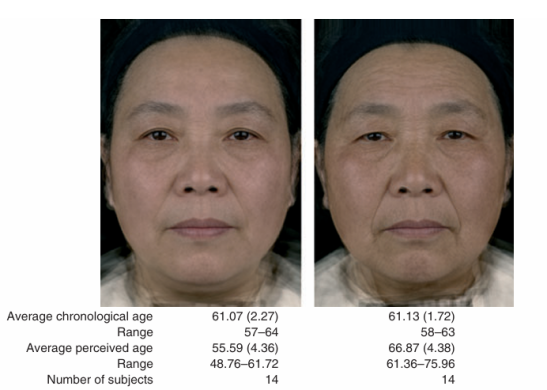 圖6 實(shí)際平均年齡為61歲的面部合成圖像。圖像由被判定為看起來比實(shí)際年齡更年輕或更年長的女性群體合成而成。左側(cè)展示了一組14名被判定為看起來比實(shí)際年齡更年輕的女性的合成圖像,右側(cè)展示了一組14名被判定為看起來比實(shí)際年齡更年長的女性的合成圖像