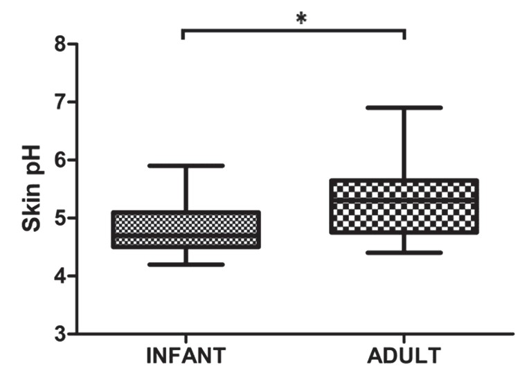 圖2 嬰兒在上臂內(nèi)側(cè)的皮膚表面pH值顯著低于成人