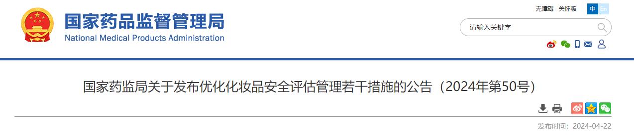 為進一步優化化妝品安全評估管理工作,有序推進化妝品安全評估制度實施,根據《化妝品監督管理條例》《化妝品注冊備案管理辦法》《化妝品安全評估技術導則(2021年版)》(以下簡稱《導則》)等相關法規要求,國家藥監局制定了《優化化妝品安全評估管理若干措施》,現予以發布,自2024年5月1日起施行。有關事宜公告如下: