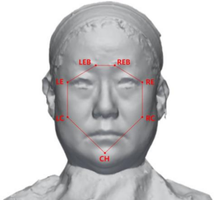 下巴中心(CH)、左臉頰(LC)、右臉頰(RC)、左眼外側(LE)、右眼外側(RE)、左眉內端(LEB)、右眉內端(REB)