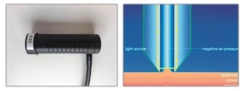 2.吸力法:測試原理是在被測皮膚表面產生一個負壓將皮膚輕吸入特定探頭內,探頭內有非接觸式發射器和接收器光學測試系統,測量從施加到消除負壓后一段時間內皮膚位移的變化情況,確定皮膚彈性性能。