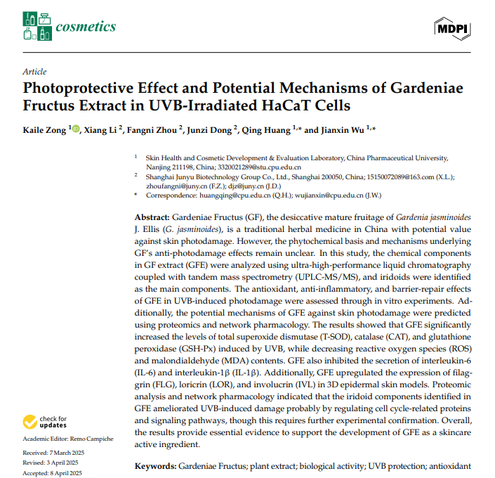 近日,杭州瑞旭科新生物技術有限公司(以下簡稱“科新生物”,CIRS Biotech)與上海君裕生物科技集團有限公司(以下簡稱“君裕集團”)聯合開展的梔子提取物(Gardeniae Fructus Extract)抗皮膚光損傷研究取得突破性進展。該項研究成果已發表于國際知名期刊《Cosmetics》(SCI收錄),為抗光損傷類化妝品功效原料的研發與評價體系構建提供了重要科學依據。