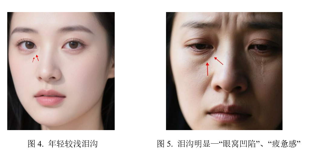 定義 | 淚溝是位于內(nèi)眼角(內(nèi)眥)開始,沿眼眶下緣向外下方延伸至面頰的一條結(jié)構(gòu)性凹陷,屬于面部自然解剖結(jié)構(gòu)的過渡線。正常情況下較淺,但隨年齡增長或特定因素可能加深,形成明顯的陰影或凹陷。 | 淚溝紋是淚溝區(qū)域表面的皮膚皺紋或細(xì)紋,通常因皮膚老化、干燥或表情習(xí)慣導(dǎo)致,表現(xiàn)為淺表的紋路,而非深層凹陷。 |
