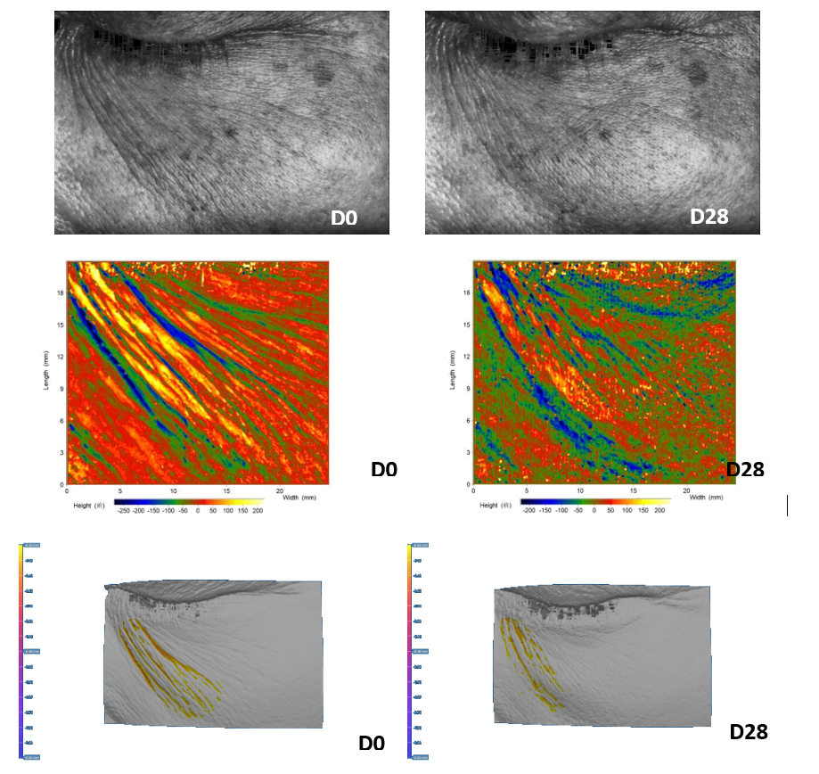 使用Primos-CR條紋光3D掃描系統(tǒng),捕獲使用產(chǎn)品前后淚溝區(qū)域3D圖,分析皺紋參數(shù)(數(shù)量、深度、面積、體積等),評估淚溝紋改善效果。