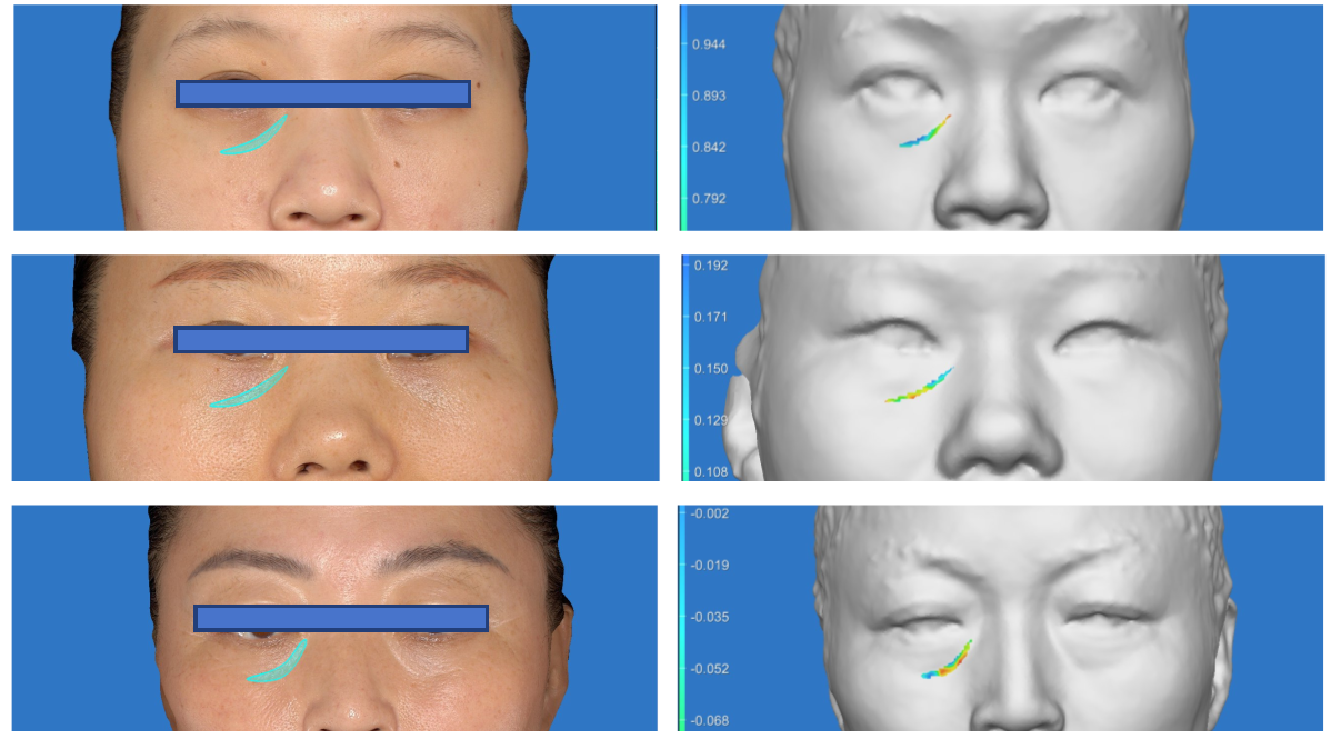 使用VectraH2 3D掃描系統(tǒng),捕獲使用產(chǎn)品前后面部3D圖,聚焦淚溝區(qū)域(往往也會伴有眼袋、黑眼圈問題,注意區(qū)分)凹陷體積變化,評估淚溝改善,這取決于產(chǎn)品效果是否顯著,醫(yī)療手段會比較明顯。